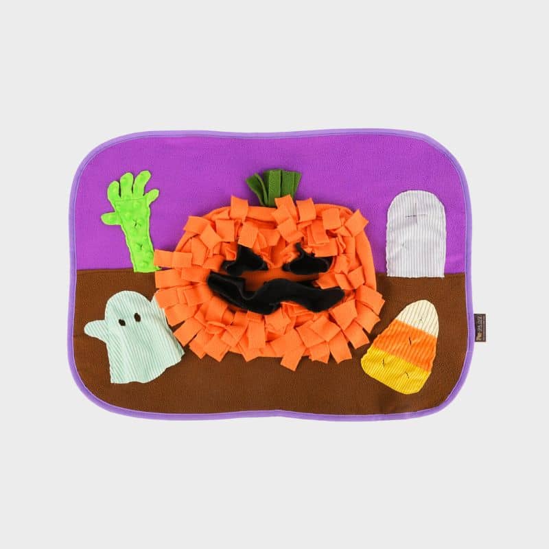De nombreux jouets Halloween pour chien sont également disponibles : peluches avec des pouic pouic pour stimuler votre poilu, des peluches de flair, des tapis de fouille mais aussi des balles pour jouer avec lui. Des design flippants comme le couteau ensanglanté mais aussi magiques comme le chaudron de sorcière ou des Dino Fringe momie !