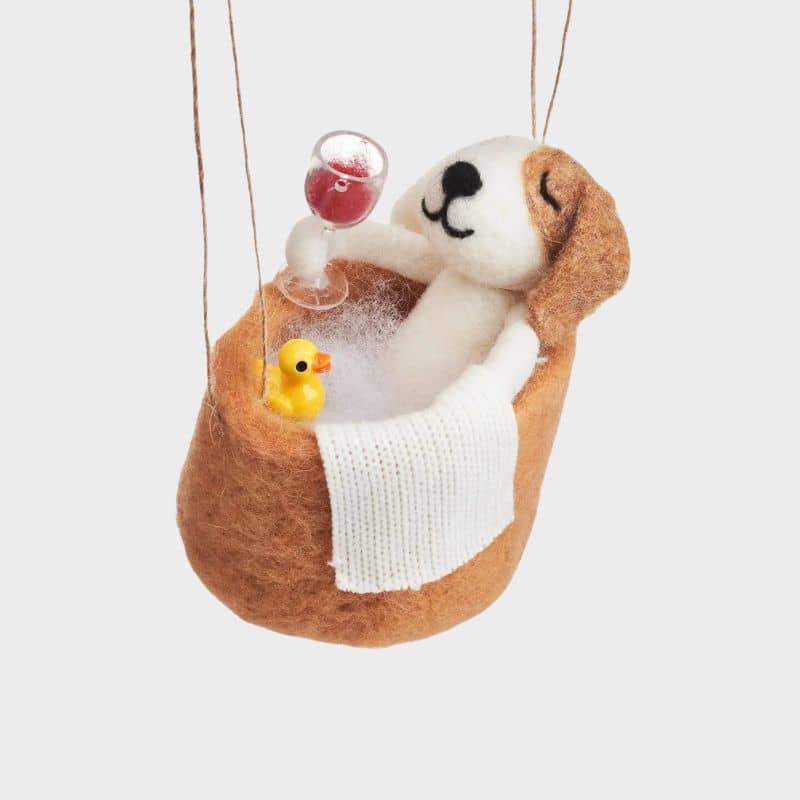 DÉCORATION DE NOËL EN FEUTRE - CHIEN DANS UN BAIN AVEC UN VERRE À LA PATTE